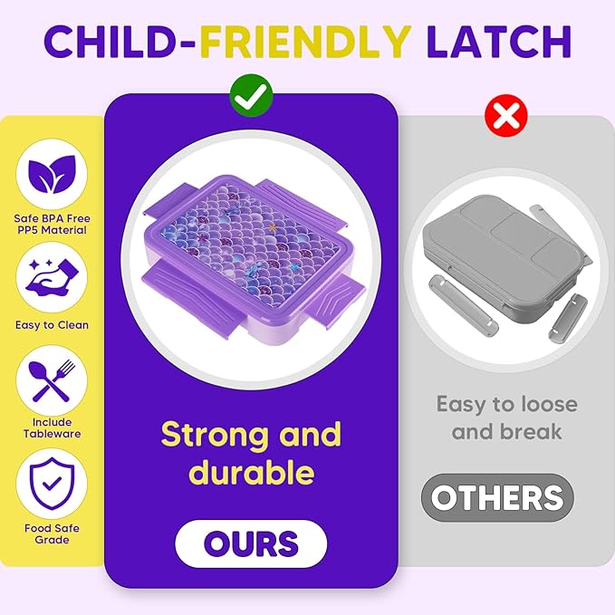 - 【Leak-Proof & Kid-friendly Latch】Our kids lunch box has four kid-friendly latches that can be easily opened by your child's little hands; built-in silicone ring, segregation seal without odor.Say goodbye to messy spills and leaks with our leak-proof lunch box. Keep your food fresh and secure, even when on the go.