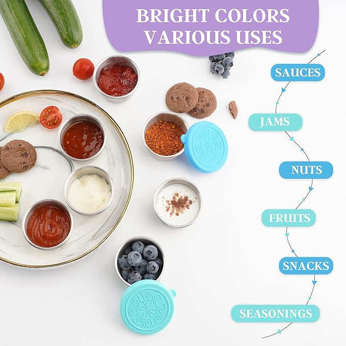 - 【EASY-OPEN COLORFUL LID】: The soft silicone lid of the sauce cups is not only cute, but also very easy to put on and take off. The colorful silicone lid set not only accommodates a variety of preferences, but can also be used to easily differentiate between different sauces in the container, making your meal prep and kitchen storage more convenient