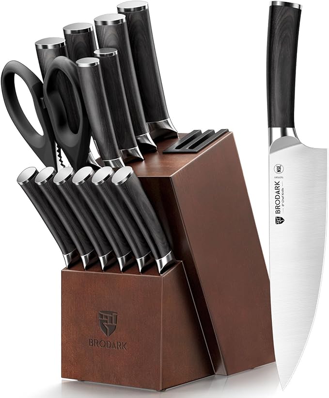 BRODARK Kitchen Knife Set, Ultra Sharp 15 Pcs Knife Set with Block, Full Tang Chef Knives, High Carbon Stainless Steel Knife Block Set with Sharpener, Wooden Handle
