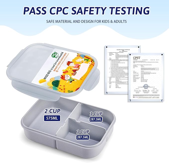 - SAFETY LUNCH BOX KIDS – MISS BIG kids lunch box containers have all passed CPC Safety Testing. Nature-friendly and free from BPAs or chemical dyes, these bento boxes are made of natural wheat fiber, ensuring they are healthy and safe for kids and adults alike. The material of this snack box container resists stains, making it easy to clean after daily use. Designed for practicality and sustainability, this bento lunch box is suitable for your everyday meals and is a reliable reusable bento box for long-term use