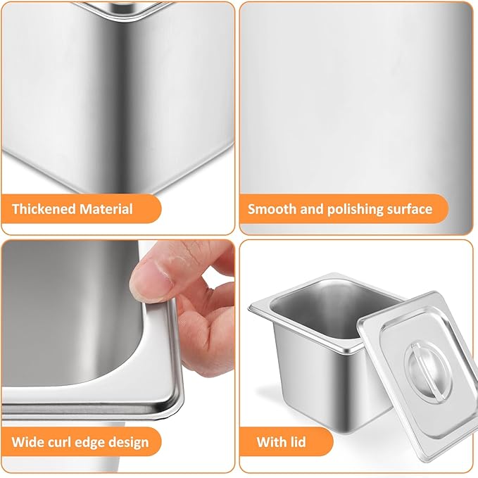 - 【Super-value Package】You will receive 6 stainless steam hotel pans with lids, measuring 1/6 of the size and 6 inches deep, each hotel pan can hold 2.7 quarts, and each is matched with a lid, that effectively prevents dust and moisture, locking in the deliciousness and freshness of your food. the right size to keep your dining table more organized to meet the unique requirements of your daily cooking and activity needs.