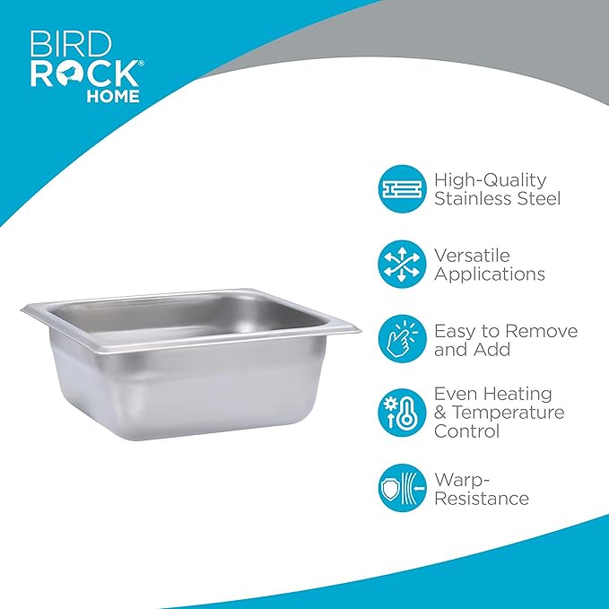- STAINLESS STEEL CONSTRUCTION: BIRDROCK HOME Steam Table Pans are designed for restaurant and catering needs. Made from 24-gauge, 304 stainless steel, these pans are suitable for meal prep, cooking, and food storage, providing a sturdy and warp-resistant structure.