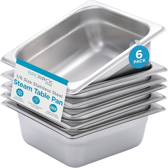 BIRDROCK HOME Stainless Steel Steam Table Pan - Hotel, Restaurant & Catering Supplies - 24 Gauge Steel, 1.2 qt Capacity - Meal Prep, Cooking, & Food Storage Container - 2.5" Depth, 1/6-Size (6 Pack)