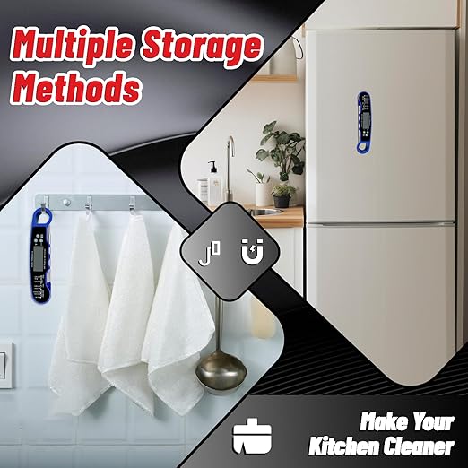- [CONVENIENCE IN LIFE STARTS WITH SIMPLE OPERATION]--The probe reads when unfolded, and closes when restored to its original position. It automatically closes after 3 minutes when not in use, saving power and providing peace of mind. The magnet and hanging hole design of the cooking thermometer will help you store it better. You can attach it directly to the refrigerator, or hang it on a hook to make your kitchen tidier.