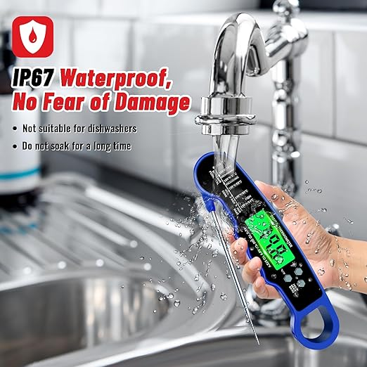 - [WEAR RESISTANT AND WATERPROOF, FEARLESS OF DAMAGE]--The shell of the instant read meat thermometer is made of high-quality wear-resistant materials, which is sturdy and anti-fall. It has also been strictly waterproofed and upgraded to IP67 waterproof level. You can choose to wipe it with a wet towel or rinse it directly with tap water (note: not dishwasher safe) without fear of causing damage.