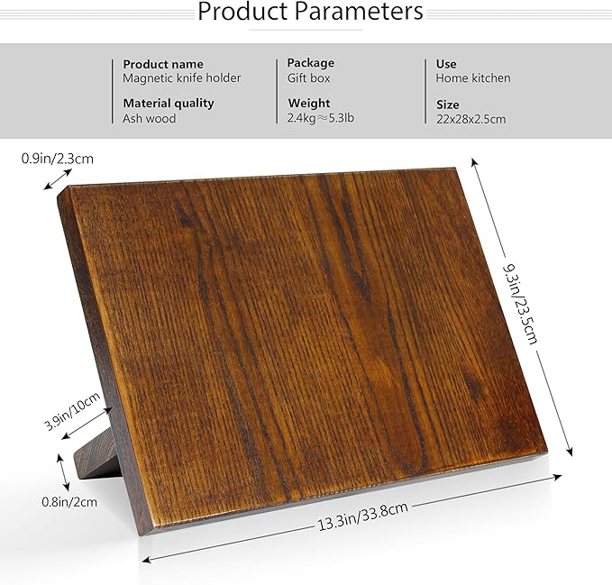- 【Space Saver】The magnetic knife block measuring is 13.3 in x 9.3 in(33.8 cm x 23.5 cm). Ultra-large capacity, can be placed 6 knives or other iron knives (except ceramic cutters).