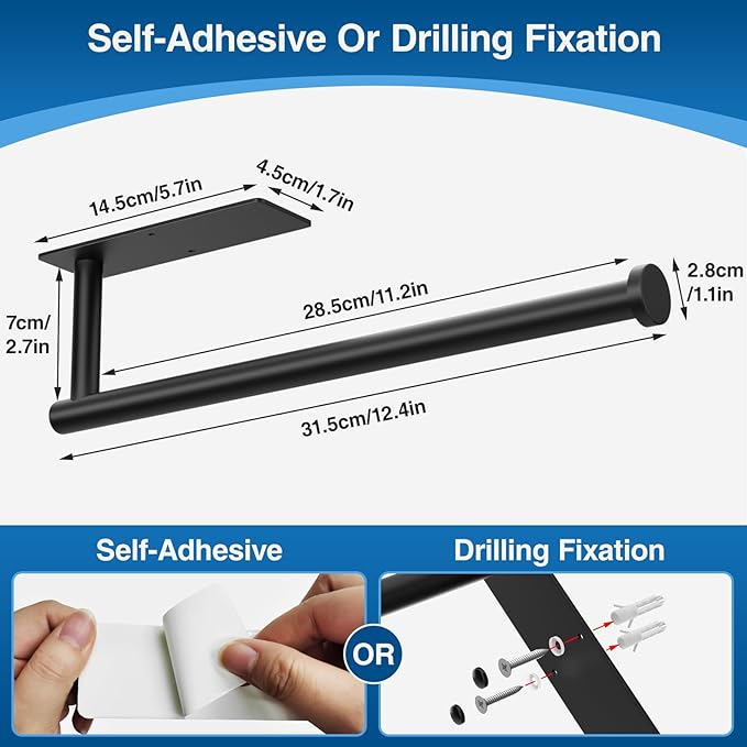 - Easy Installation: There are two ways to install this paper towel holder, self-adhesive or drilled, you can freely choose the appropriate installation method according to your wall or cabinet situation.