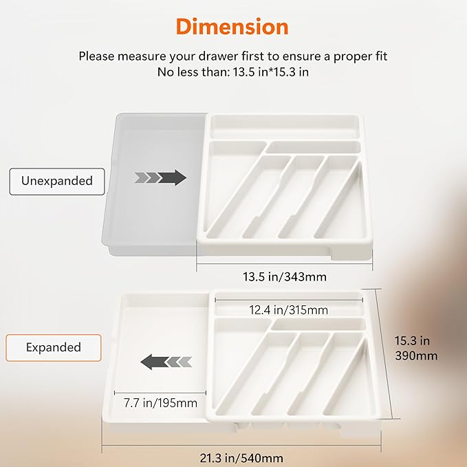 - Smooth Pull: Our silverware organizers for kitchen drawers is adjustable to fit drawers of different sizes, the smooth pull-out track makes it easy to pull out, and the expandable panel on the left ensures it has enough capacity to store more large and long kitchen utensils, keeping everything in order