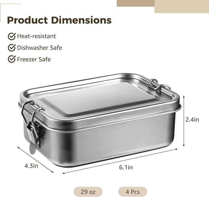 - Sufficient Quantity & Food-safe Material: Includes 4 bento boxes, enough for daily use and replacement needs; crafted from quality 304 stainless steel, these boxes are food-safe and harmless, ideal for keeping your meals fresh and safe