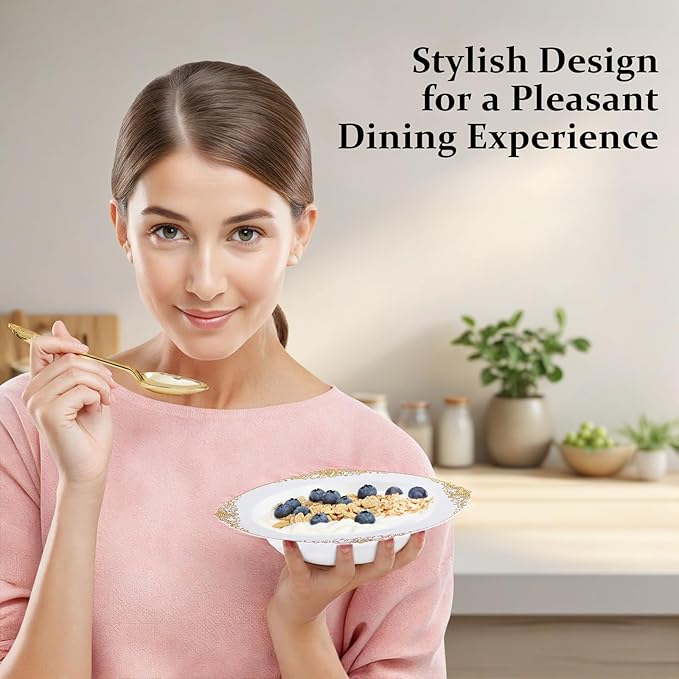 - Elegant Design: These gold disposable plastic bowls with a pure white base design with sparkling gold edges, a simple classic design to bring a touch of elegance to your luxurious party arrangements