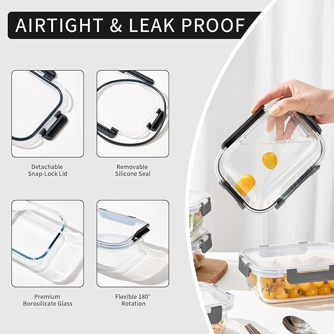 - Airtight Locking Lids: These glass food containers feature removable silicone seals and 4-hinge snap locks to prevent leaks, ensuring your food stays fresh; The lids are easy to open and close; Remember to remove the lid before heating or washing