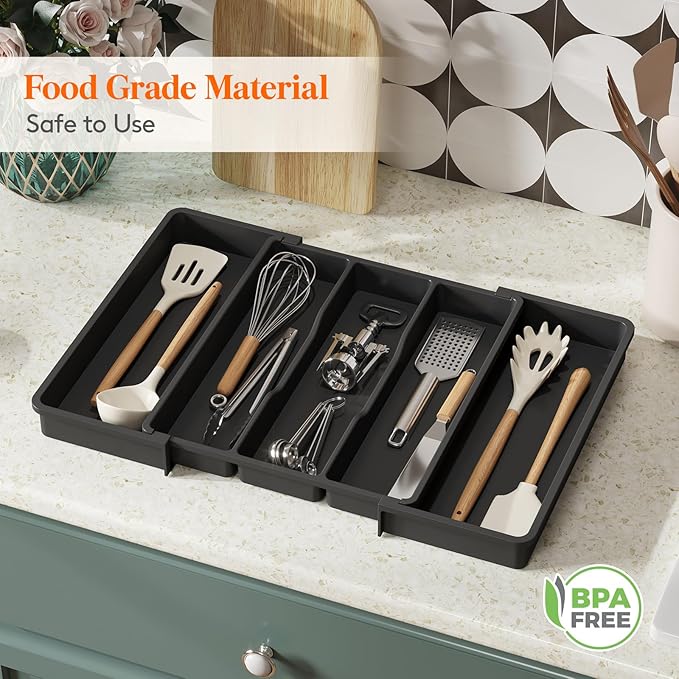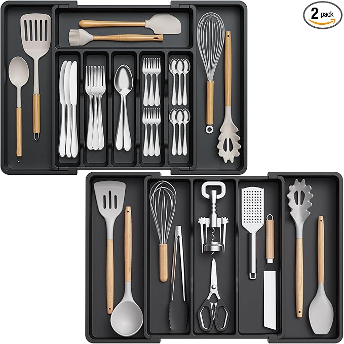 Lifewit Silverware Drawer Organizer and Utensil Organizer Set, Expandable Cooking Cutlery Tray for Kitchen, Adjustable Plastic Flatware Holder Storage Divider for Spoons Forks Knives, Large, Black
