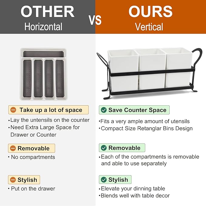 - FUNCTIONAL UTENSIL CADDY: The three compartments are set in a metal rack with a compact measurement of 13.2" L x 3.7" W x 5.5" H and each of the containers is removable separately, the rectangle holder can equip with a good amount of utensils, It is good idea to refresh a cluttered kitchen counter and well-organized by this stylish silverware holder