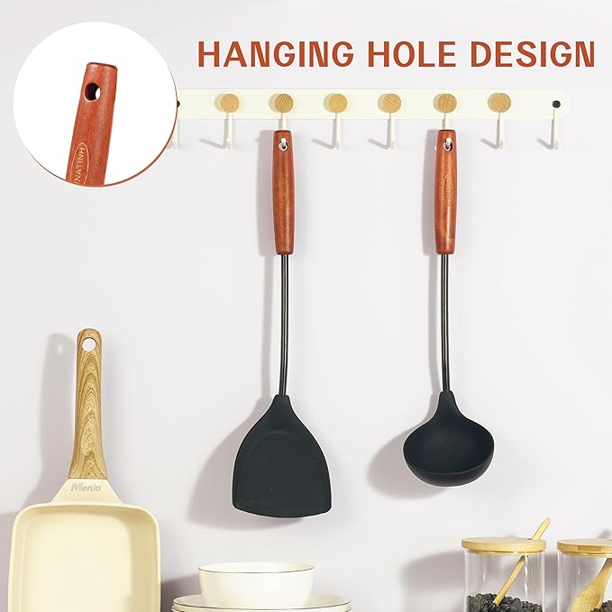 - Easy to clean silicone spatula : Black silicone will not leave food grease ; round hanging hole also makes it easy to dry and hang