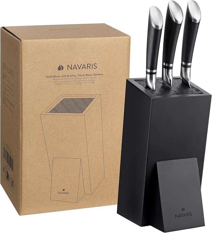 Navaris Knife Block, Black - Universal Knife Storage Solution - Bamboo Kitchen Knives Holder with Bristles - Tilted Storage for Easy Access - Removable Insert for Easy Cleaning
