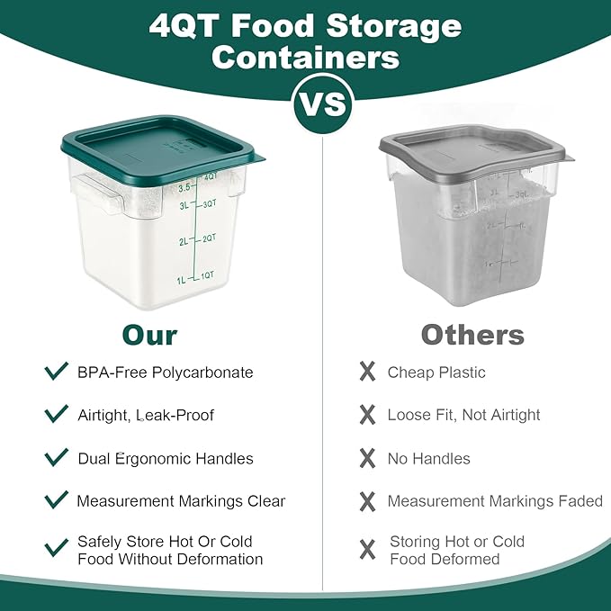 - Durable Food Grade Storage: Crafted from high-quality, BPA-free polycarbonate, these 4 quart containers with green lids are shatterproof, withstand temperature fluctuations, and are safe for storing hot or cold foods — ideal for professional kitchens and home use