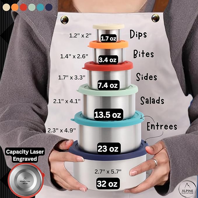 - Convenient Sizes: Our stainless steel containers with lids come in a range of sizes: 32oz, 23oz, 13.5oz, 7.4oz, 3.4oz, and 1.7oz, perfect for packing lunches, snacks, dips, sauces, nuts, seeds, and more. They will meet all your food storage needs.