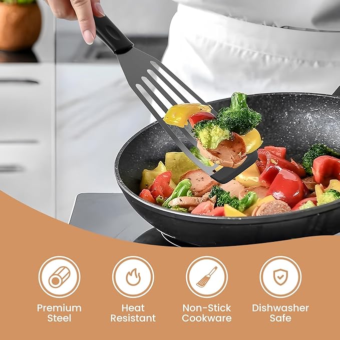- [Slotted Turner Spatula]: This fish spatula stainless steel is 0.8mm thin, with a curved design and beveled edges for easy to flip food. It is strong enough to lift food easily. Slotted spatulas for cooking are designed to drain excess oil and grease.