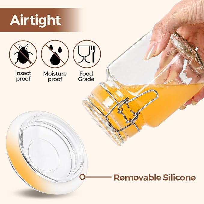 - Leak-Proof Small Jars: These food-grade 8oz glass jars with lids feature silicone gaskets and stainless steel clips for airtight sealing. Ideal for keeping food fresh for storing liquids like dressings, sauces, soups and jam