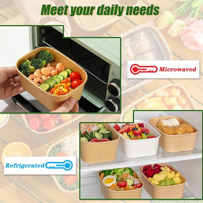- Resistant and Reliable - Our Paper Meal Prep Containers with Lids 35 oz are thickened to be water and oil-proof, guaranteeing no leakage for up to 72 hours. Ideal for everyday meals, family gatherings, outdoor picnics, and travel, they paper take out containers serve excellently as takeaway containers and are perfect for keeping foods fresh in the refrigerator.