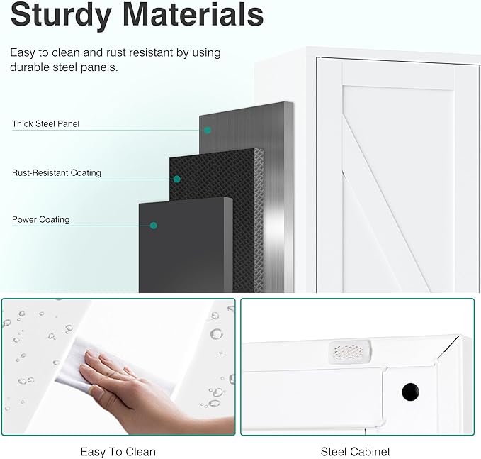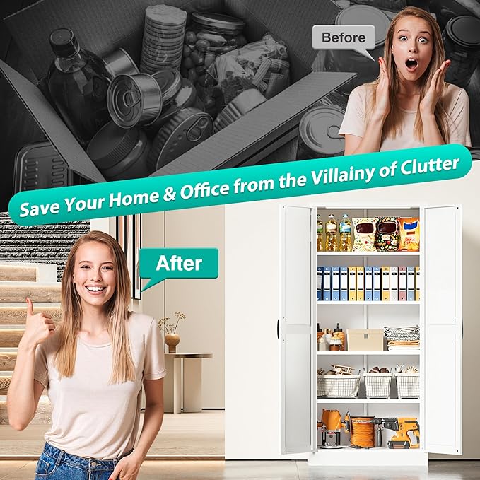 - Sturdy,Durable and Safe: Made of powder-coated steel plate, this cabinet with door and shelf is sturdy,durable and easy to clean.Load capacity is up to 120lbs each shelf. The included anti-tip kit helps secure the pantry cabinets to the wall to give you a safer living space.
