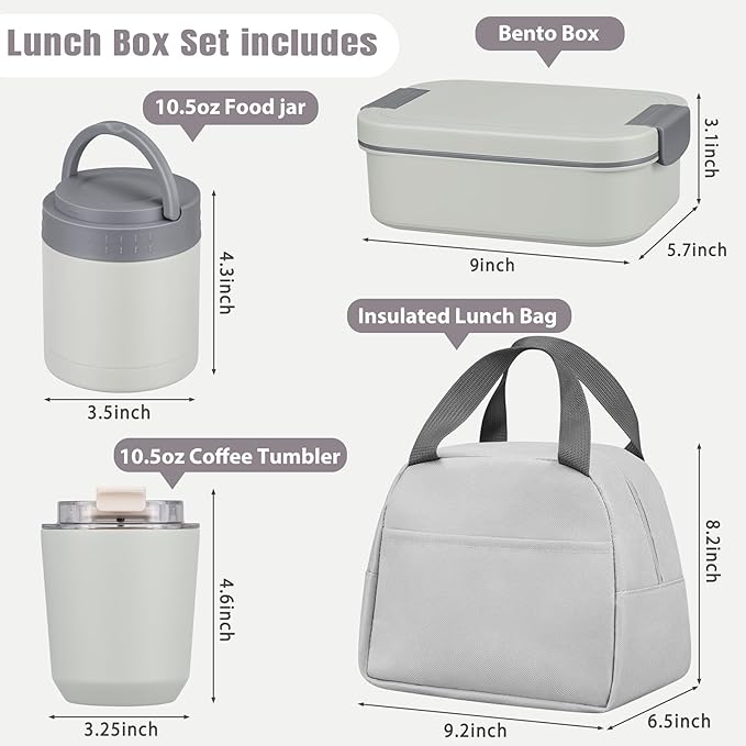 - Lunch Food Containers Set Includes: You will get 1 Bento Box with Spoon,Fork and Sauce Jar, 1 Lunch Bag, 1 10.5oz Coffee Tumbler, 1 10.5oz Insulated Food Jar. This bento box set can meet your needs for daily dining accessories