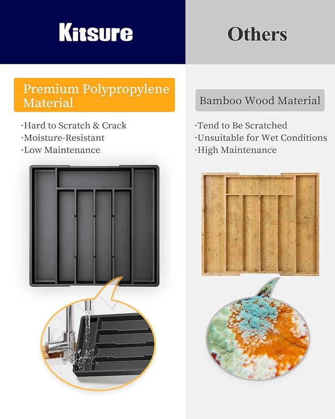 - EXPANDABLE FOR CUSTOMIZABLE FIT: No more messy cutlery drawers! The Kitsure flatware organizer for drawers features an expandable width from 8.1" to 13.2", making it a perfect fit for most kitchen drawers. Whether you have a compact space or a larger storage area, this adjustable utensil holder ensures an organized and clutter-free setup.
