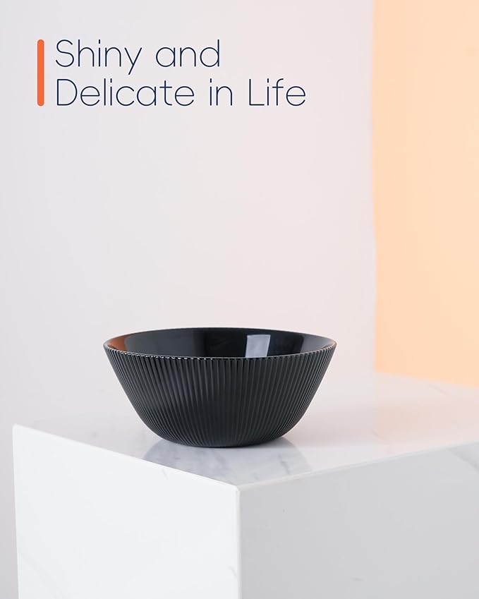 30 OZ Max Cereal Soup Bowl Set of 6, Opal Glass 7.2 inch Black Ribbed Bowls for Ramen, Noodle, Salad, Fruit, Dishwasher and Microwave Safe