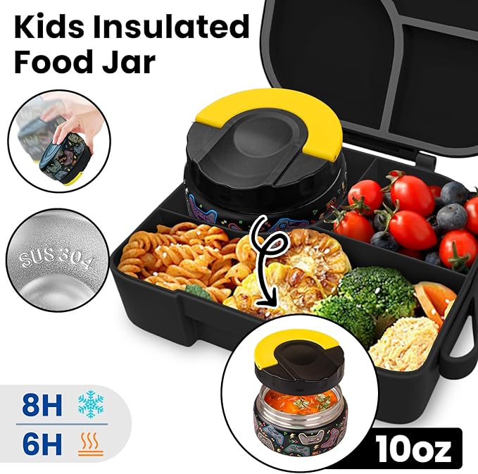 TinyPalsa Bento Box for Kids with 10oz Thermos, Durable Lunch Box with Leak Proof Insulated Food Jar, 3 Compartments with Portable Handle for Ages 3+, Dishwasher Safe, Ideal for School, Travel (Game)