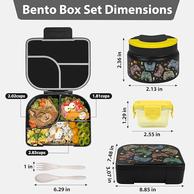 - All-in-One Lunch Solution: More than a kids’ bento box—it’s a complete meal system! The 3-compartment tray keeps flavors separate, paired with a leak-proof thermos, sauce cup, and utensils. No extra containers—lunch made simple