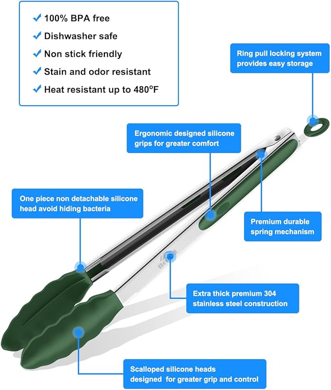 - SAFE AND HARMLESS TO YOUR FAMILY : We use the highest quality food-grade silicone for the cooking tong tips, which won't scratch your cookware. It has passed the safety test, and is also 100% BPA free and able to resist up to 600°F of heat. Easy to clean and dishwasher safe.