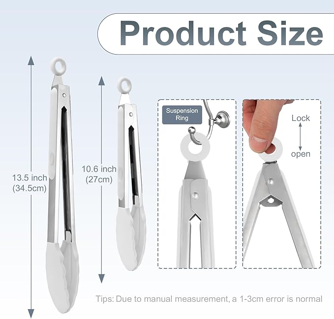 - Easy To Store- These kitchen tongs have locking mechanism, pull the ring for lock and push for unlock, super easy operation.Hang them with the hanging loop after use or put in the drawer by pulling the ring to lock it, space saving.