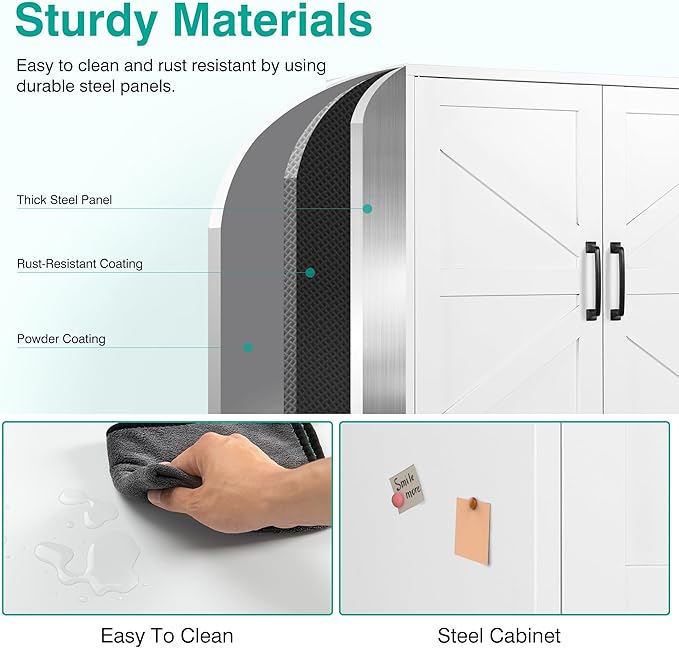 - 【Sturdy,Durable and Safe】: Made of powder-coated steel plate, this white cabinet is sturdy,durable and easy to clean.Load capacity is up to 120lbs each shelf. The included anti-tip kit helps secure the pantry cabinets to the wall to give you a safer living space.