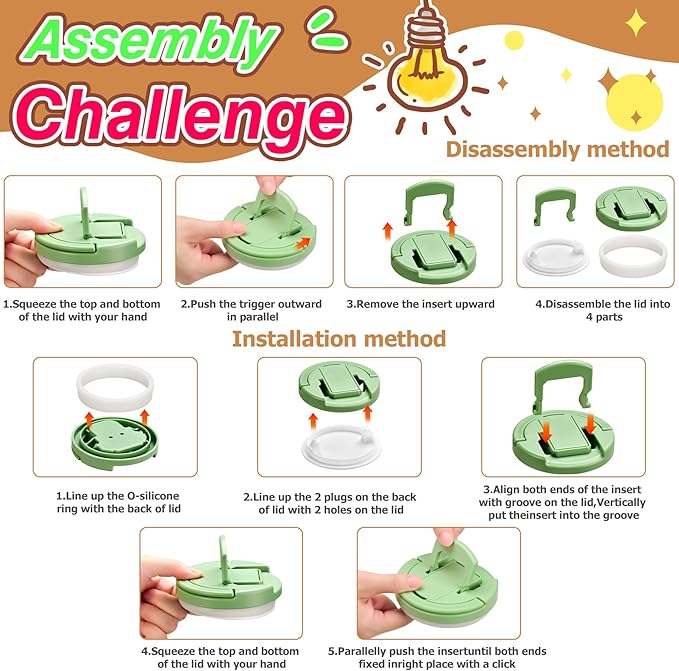 - Share your challenge: If you don't watch the video or installation manual, only a very small number of people can disassemble and install the lid by themselves,Welcome to challenge the disassembly and assembly of the lid.After successfully disassembling and assembling the lid, you will find it very interesting. If you do not know how to install the product after receiving it, please refer to the installation video and step-by-step pictures for instructions.