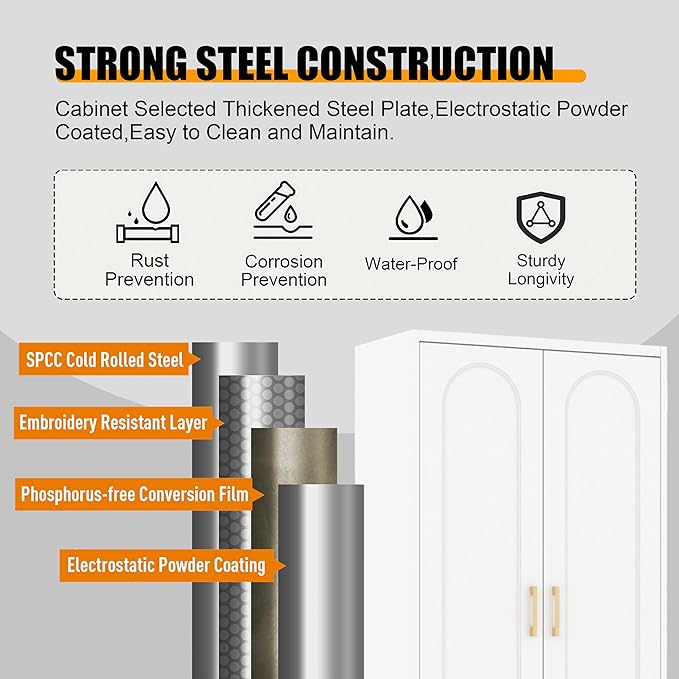 - Metal Material: The tall kitchen cabinet is made of cold-rolled steel plate, with a powder coating process to prevent rusting. Sturdy, easy to clean surfaces. The white metal cabinets come with an anti-tip feature that prevents the cabinets from tilting and protects your family