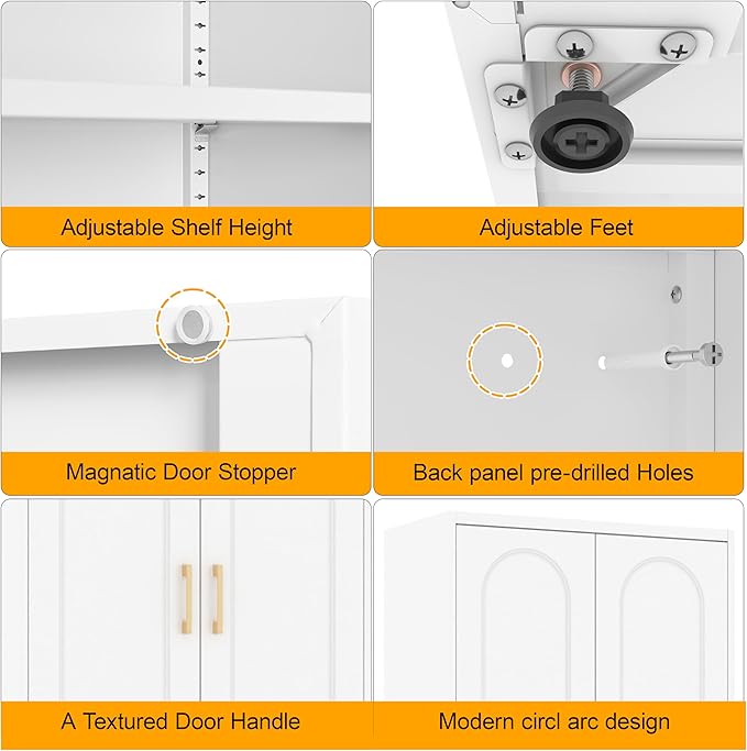 - Stylish Design: Metal storage cabinet door features a sleek circl arc design, 2 gold handles and have magnetic door stops on the top inside of the doors. White pantry storage cabinets adds character and charm to the home office