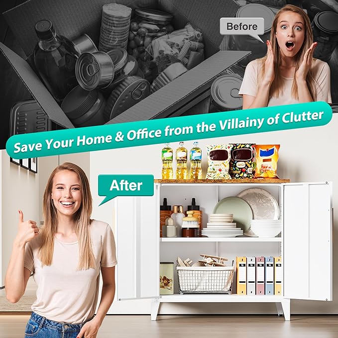 - 【Large Capacity with 3 Tier】: White storage cabinets have 2 tier inside and wood top for you to store kinds of daily use,sundries,toys,tools,food,kitchen appliances and supplies.Let you organize your space like a pro. Save your home from the villainy of clutter.