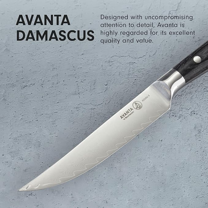 - STEAK KNIFE SET - Avanta Damascus knives pair elegant Scandinavian design with premium Japanese blades. The set was designed with uncompromising attention to detail, featuring beautiful double-riveted ebony Pakkawood handles for comfort & durability.