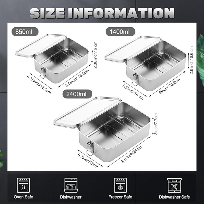 - Portable and Suitable Sizes: the stainless steel lunch container has a compact and portable design, making it easy to take outside; The containers come in 3 different sizes about 28.7 oz/ 850 ml, 47 oz/ 1400 ml, 81 oz/ 2400 ml in capacity; Its convenient size and shape fit well in most lunch bags, briefcases, and backpacks, allowing you to enjoy your meals anytime, anywhere
