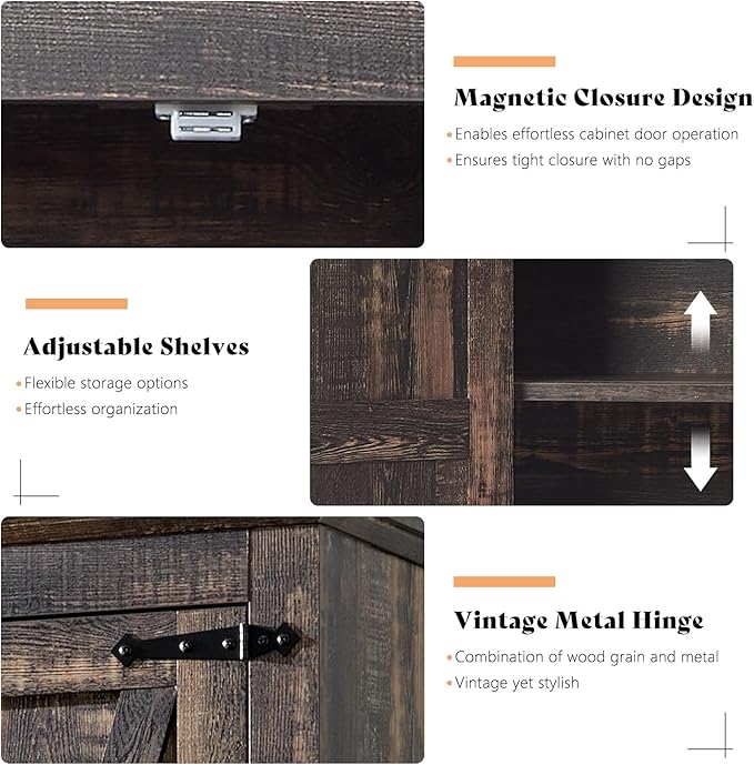 - Farmhouse Style: This farmhouse pantry cabinet features barn doors for a vintage yet stylish look. Whether it's in a kitchen, dining room, or living room, its simple look will match perfectly with any furniture in your home.