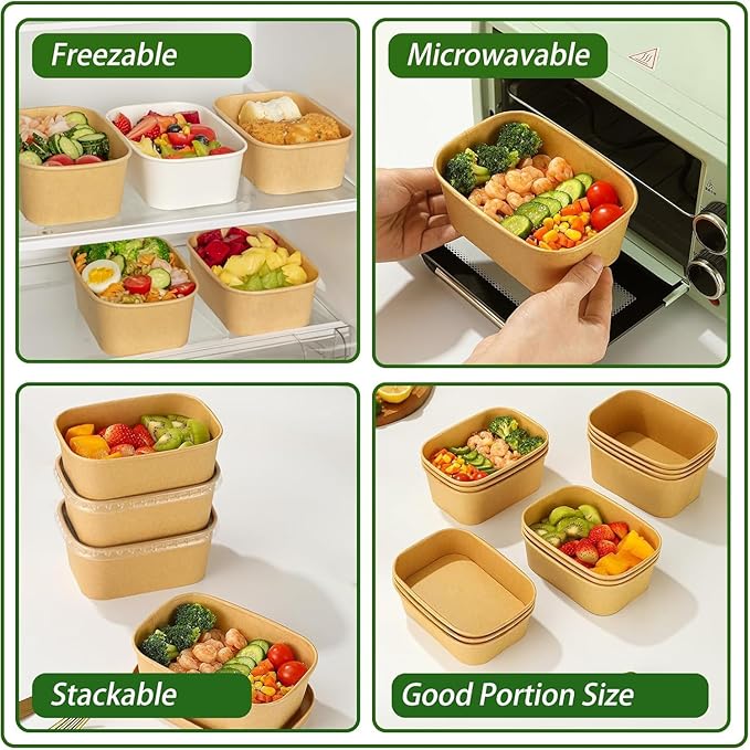 - Resistant and Reliable - Our Paper Meal Prep Containers with Lids 29 oz are thickened to be water and oil-proof, guaranteeing no leakage for up to 72 hours. Ideal for everyday meals, family gatherings, outdoor picnics, and travel, they serve excellently as food prep containers, takeaway containers and are perfect for keeping foods fresh in the refrigerator.
