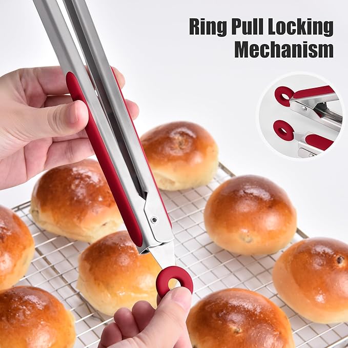 - Do the cooking tongs lock closed for easy storage? Each tong features a ring-pull locking mechanism for compact storage. Simply pull the ring to lock the tong, and push it to release. The smooth pull-down design prevents accidental opening and ensures the tong stay securely locked, saving space in your kitchen drawer or utensil holder. The ring also doubles as a loop — convenient to hang on the wall racks. Heavy-duty spring offers strong tension and quick rebound for a firm, responsive grip.