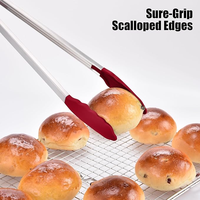 - Are tips heat-resistant and non-scratch? The tips of the tong are coated with high-quality, food grade silicone that is heat-resistant up to 600°F (315°C), making them safe for directly handling hot foods from the oven, stovetop, or grill. Unlike metal-tipped tongs, the soft silicone tip won’t scratch or damage non-stick pans or grill grates. The scalloped edges are specially designed to provide a secure, non-slip grip, easy to grasp delicate vegetables, smooth meat, or small pieces of food.