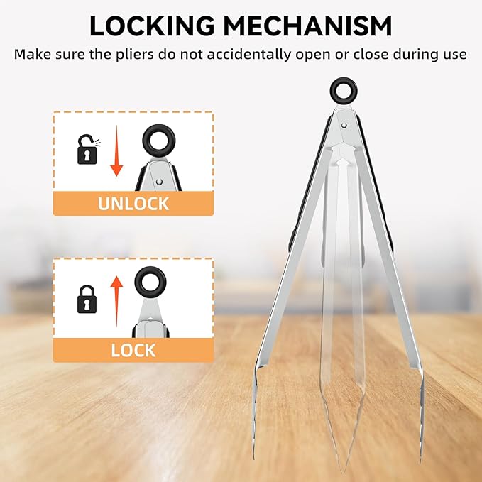 - EASY TO STORE: Kitchen tongs have a locking mechanism to ensure that the tongs will not be accidentally opened or closed during use, pull the ring to lock and push to unlock, giving you better control over cooking, and the operation is super simple. Hang them with the hanging ring after use or lock them by pulling the ring and put them in the drawer, saving space.