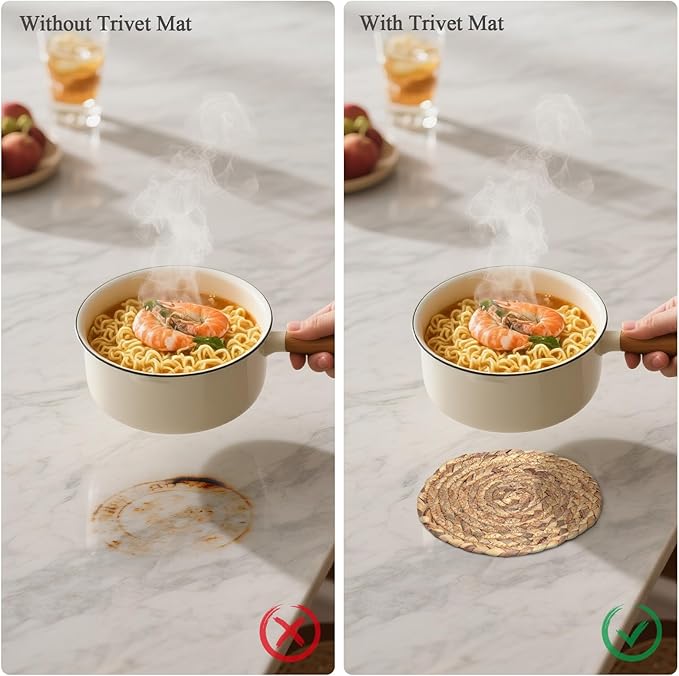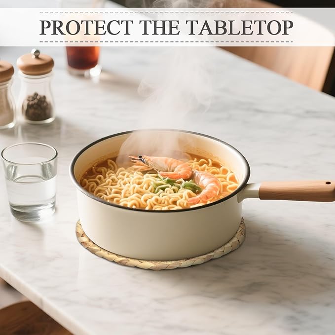 - Material: Hand-woven from natural water hyacinth grass. Its heat resistance is better than that of silicone pads, and it will not melt. Besides, the natural straw has no peculiar smell at all.