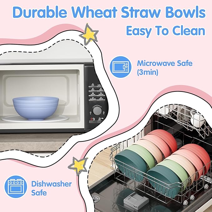 - Dishwasher & Microwave Safe(3min): wheat straw bowls are perfect for quick heating (won't get too hot) and easy cleaning.The Soup bowls smooth surface resists stains and fits in dishwashers, saving your precious time