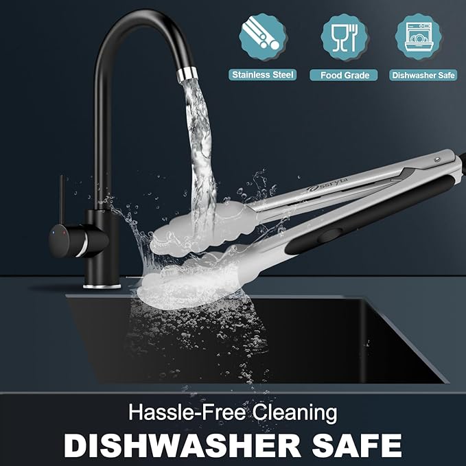 - PREMIUM FOOD-GRADE STAINLESS STEEL - Professional kitchen tongs feature heavy-duty 1mm thick stainless steel for exceptional durability. The seamless design eliminates weak joints, providing superior heat resistance (up to 600°F), rust-proof performance, and effortless cleaning. Unlike flimsy tongs, our tongs maintain perfect balance with lightweight ergonomic handles for comfortable, precise control during cooking. Dishwasher safe and odor-resistant for lasting kitchen performance.