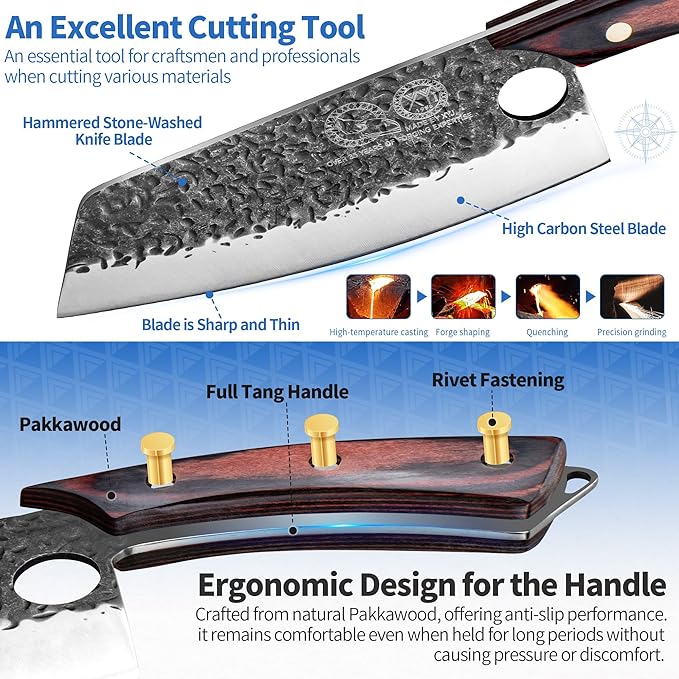 - 【High Carbon Steel Full Tang Blade】The XYJ knife features an ergonomic full tang design for improved stability and comfort. The handle is made from premium materials, providing durability and slip resistance for confident handling. The blade is forged using a stonewashed and hammer finish treatment, making it tough, wear-resistant, and non-sticking. Proper care is required for high carbon steel knives to prevent corrosion, but with regular maintenance, these knives will maintain their sharpness