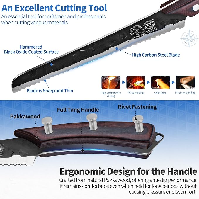 - 【High Carbon Steel Full Tang Blade】The XYJ knife features an ergonomic full tang design for improved stability and comfort. The handle is made from premium materials, providing durability and slip resistance for confident handling. The blade is forged using a stonewashed and hammer finish treatment, making it tough, wear-resistant, and non-sticking. Proper care is required for high carbon steel knives to prevent corrosion, but with regular maintenance, these knives will maintain their sharpness