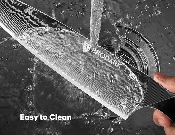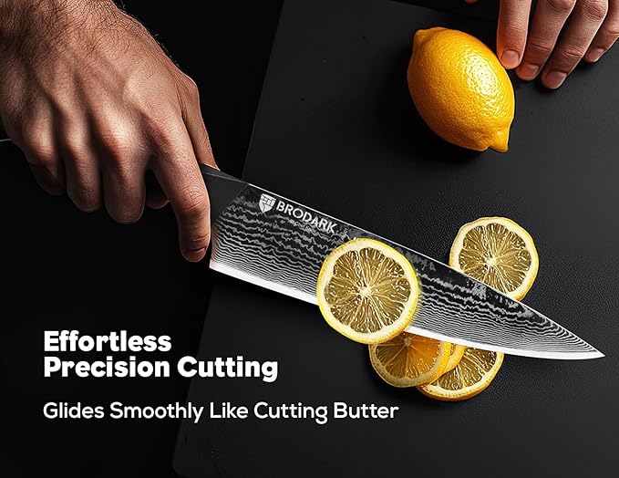 - Unmatched Sharpness: BRODARK damascus knife set, with an super steel core and 67 layers of high-carbon Damascus steel, is precision-forged for a 10-15 degree honed edge. It can slice ripe tomatoes effortlessly, cutting with butter-like ease and exact